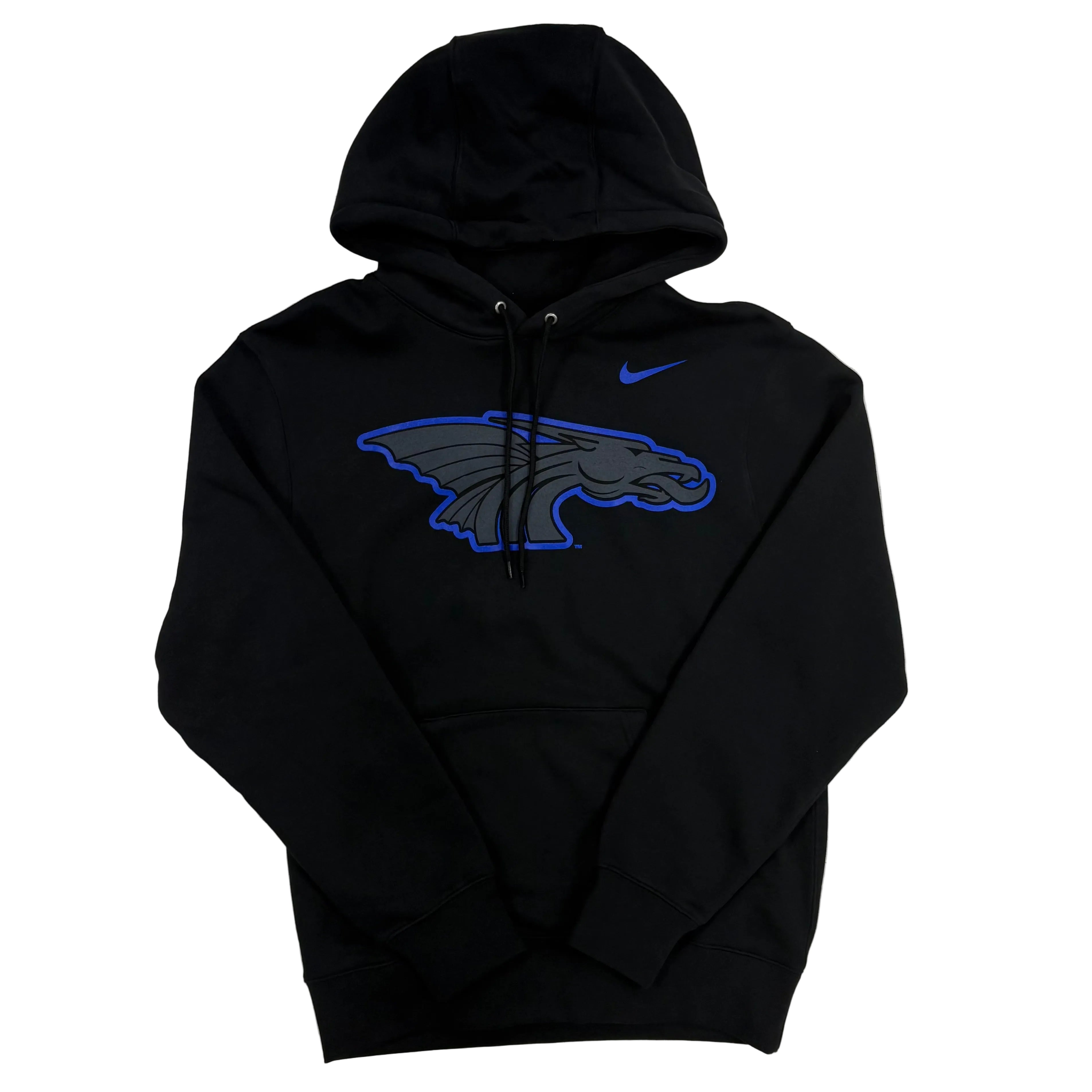 Our best seller this year! Unisex. A black Nike hoodie featuring a gray power dragon outlined in royal blue.
