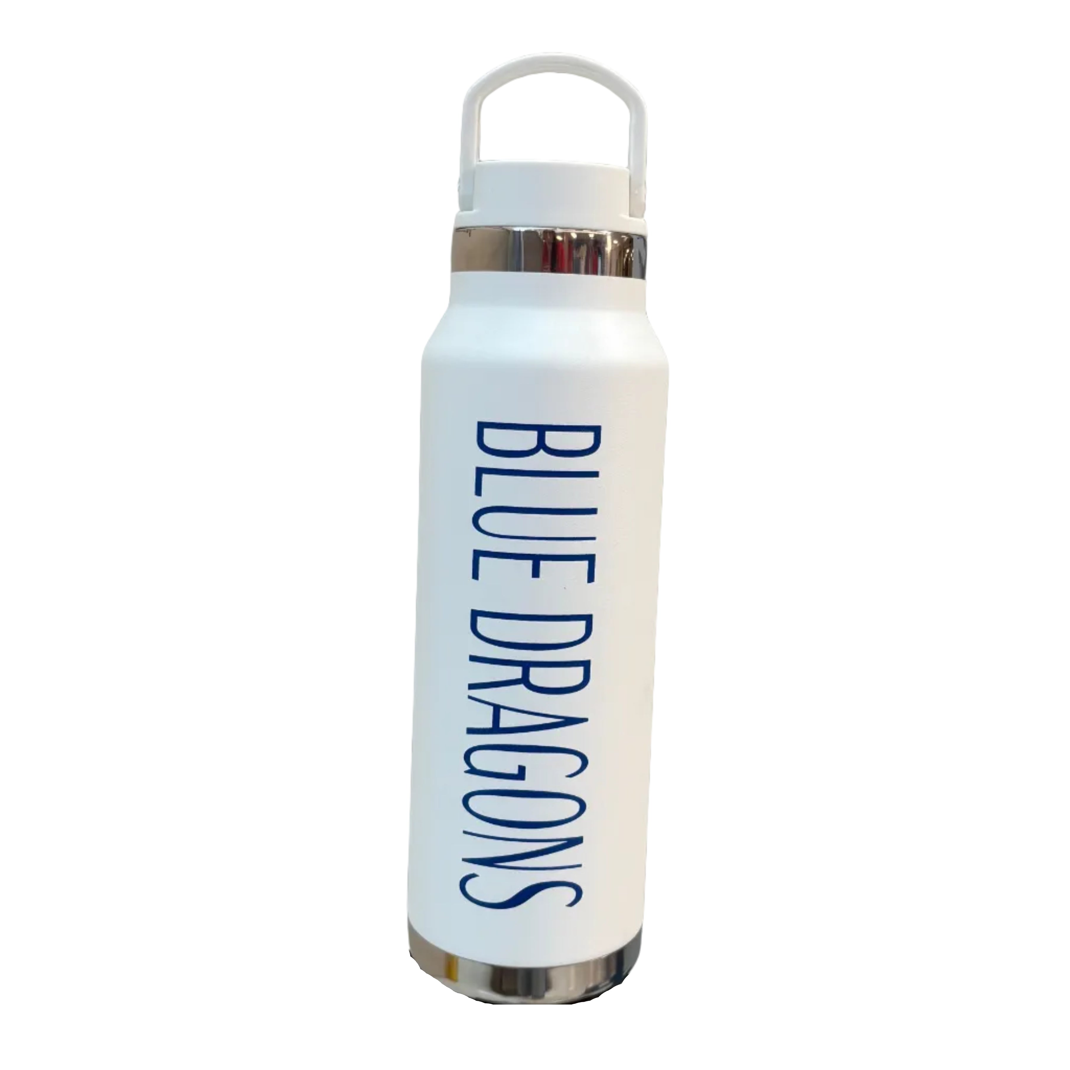 White insulated water bottle that says "HUTCHINSON" in navy on one side and "BLUE DRAGONS" on the other!