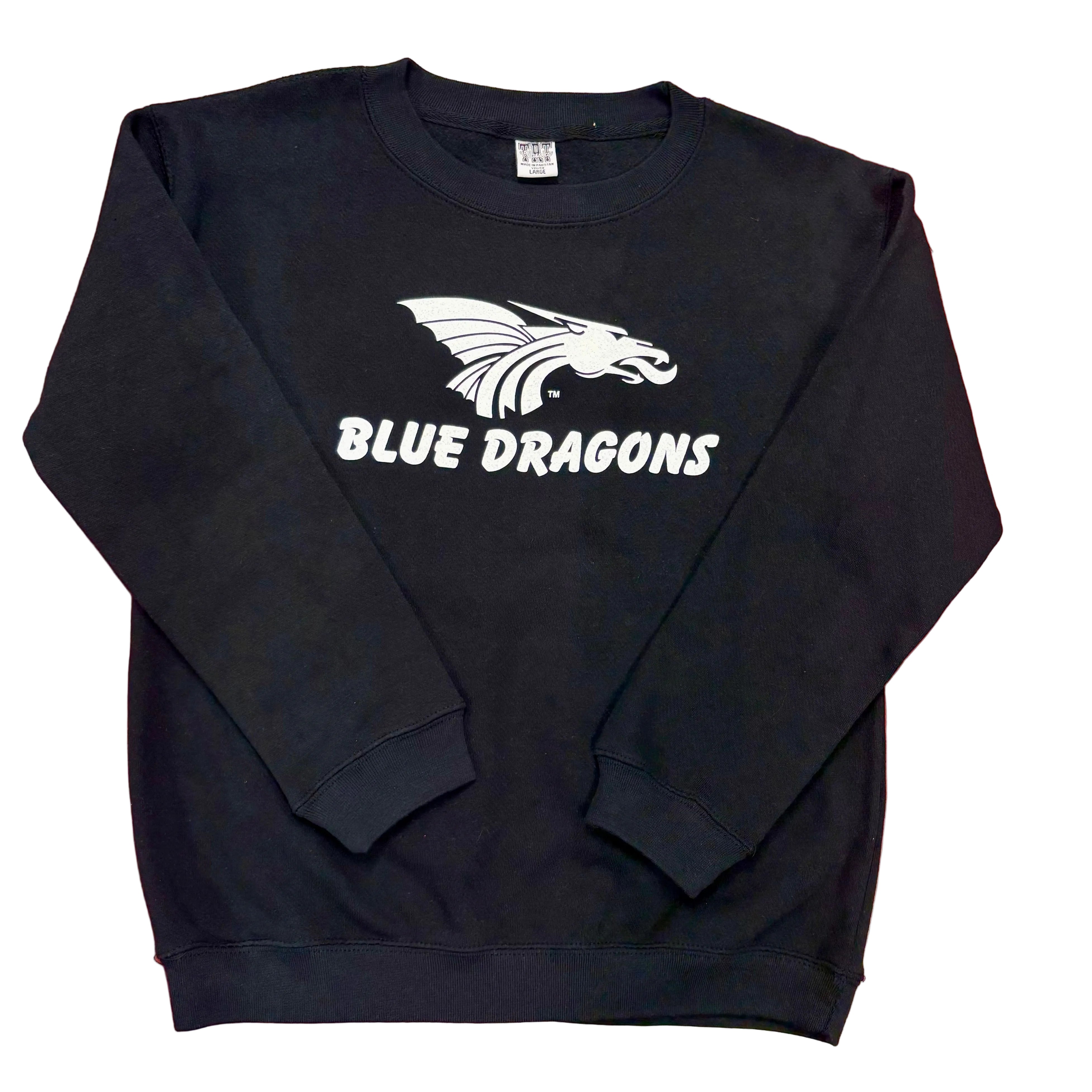 Youth, 70/30 cotton, black crew with white power dragon and font. Unisex.