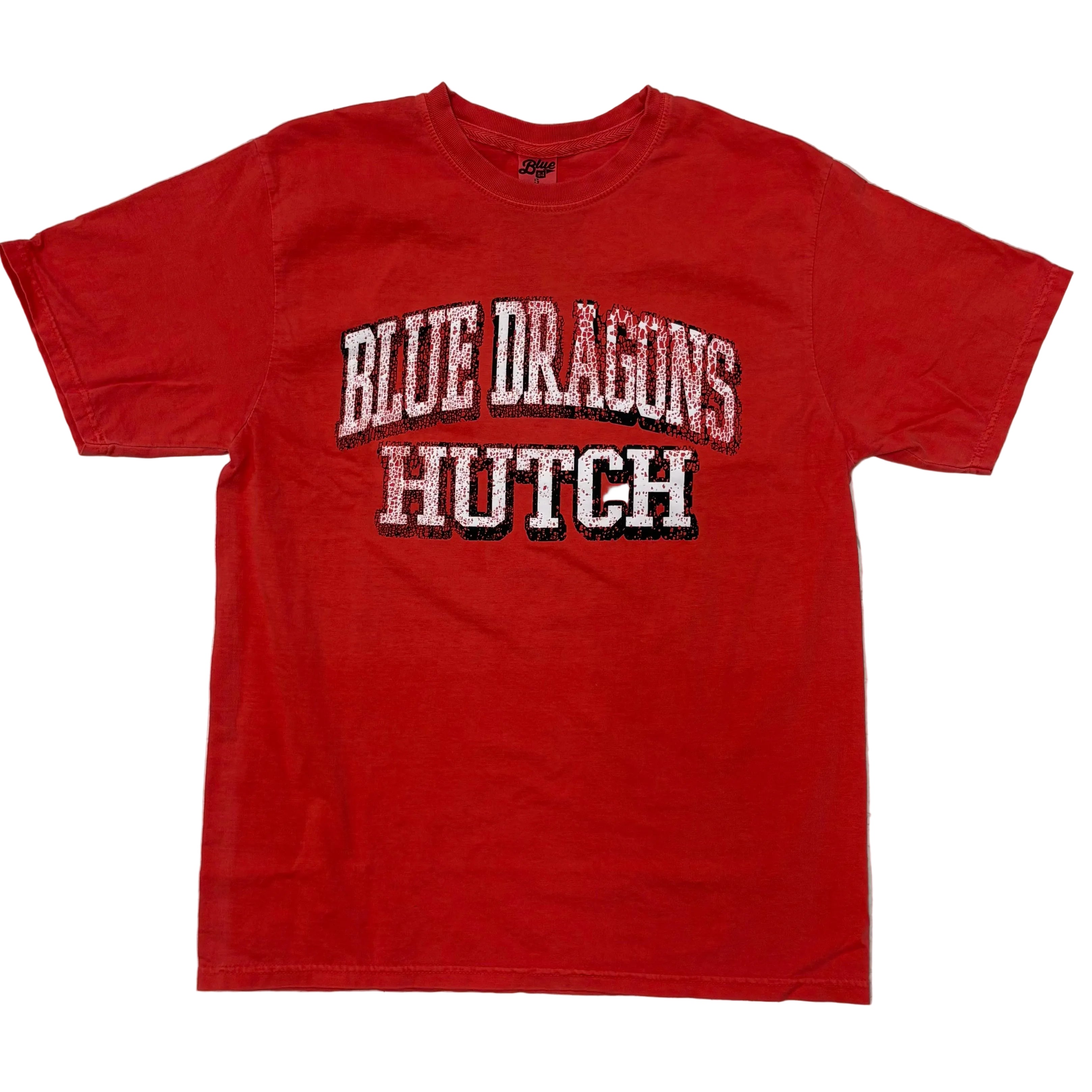 Nice, thick tee with a white, "crackled," distressed look on the font. Available in washed blue and washed red.