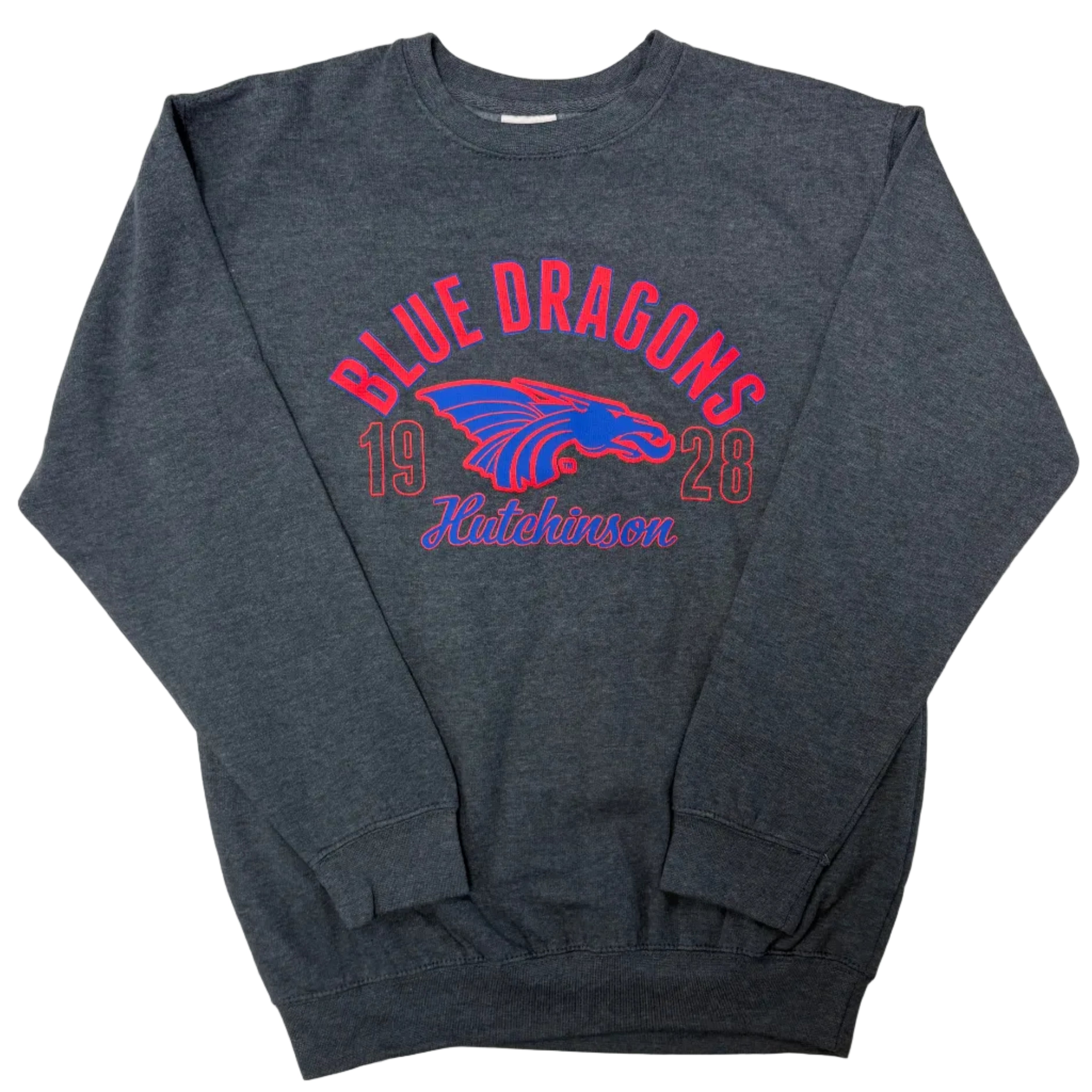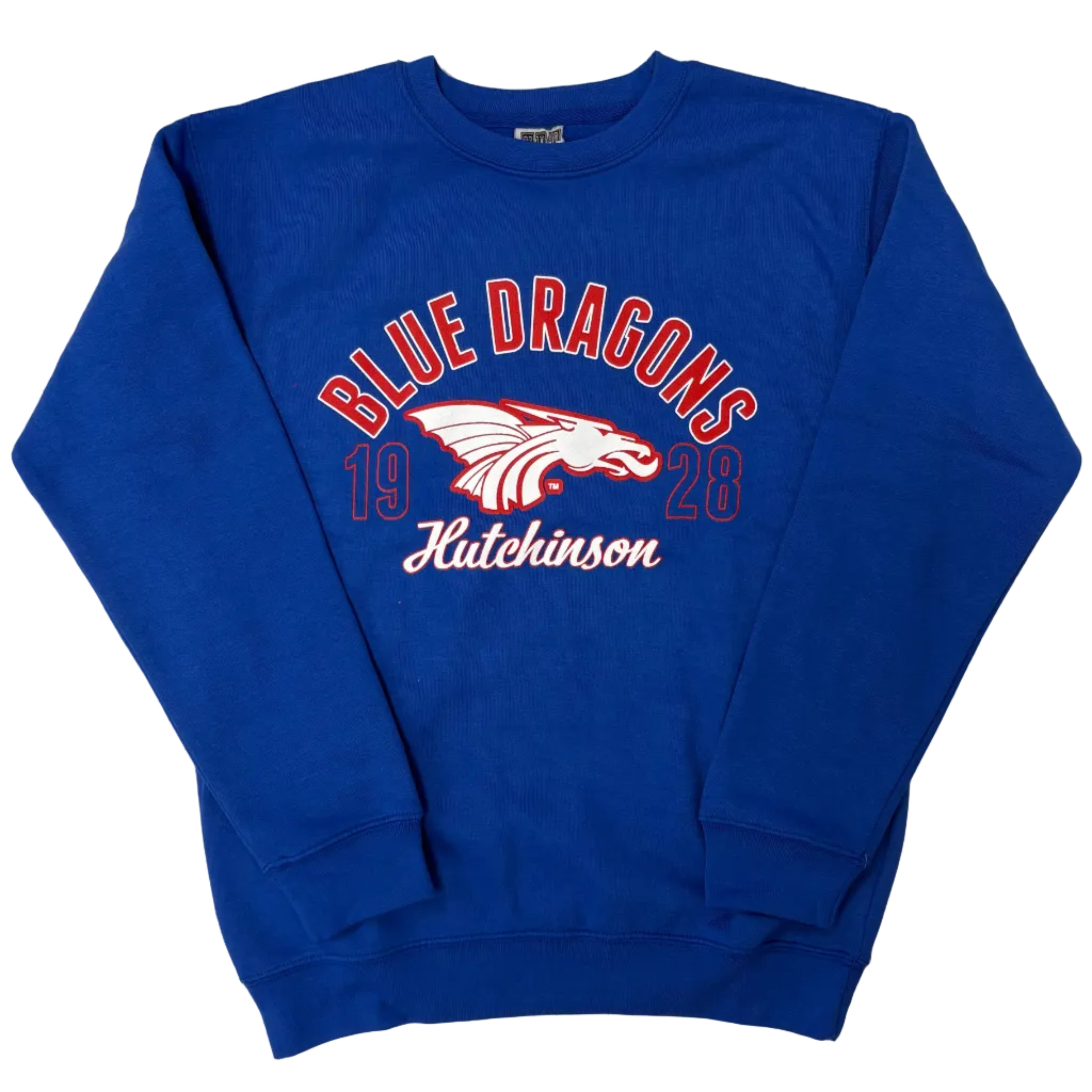 Game day fleece crew that reads "BLUE DRAGONS 1928 HUTCHINSON" with a centered power dragon. Available in charcoal gray, royal blue, or fire engine red.