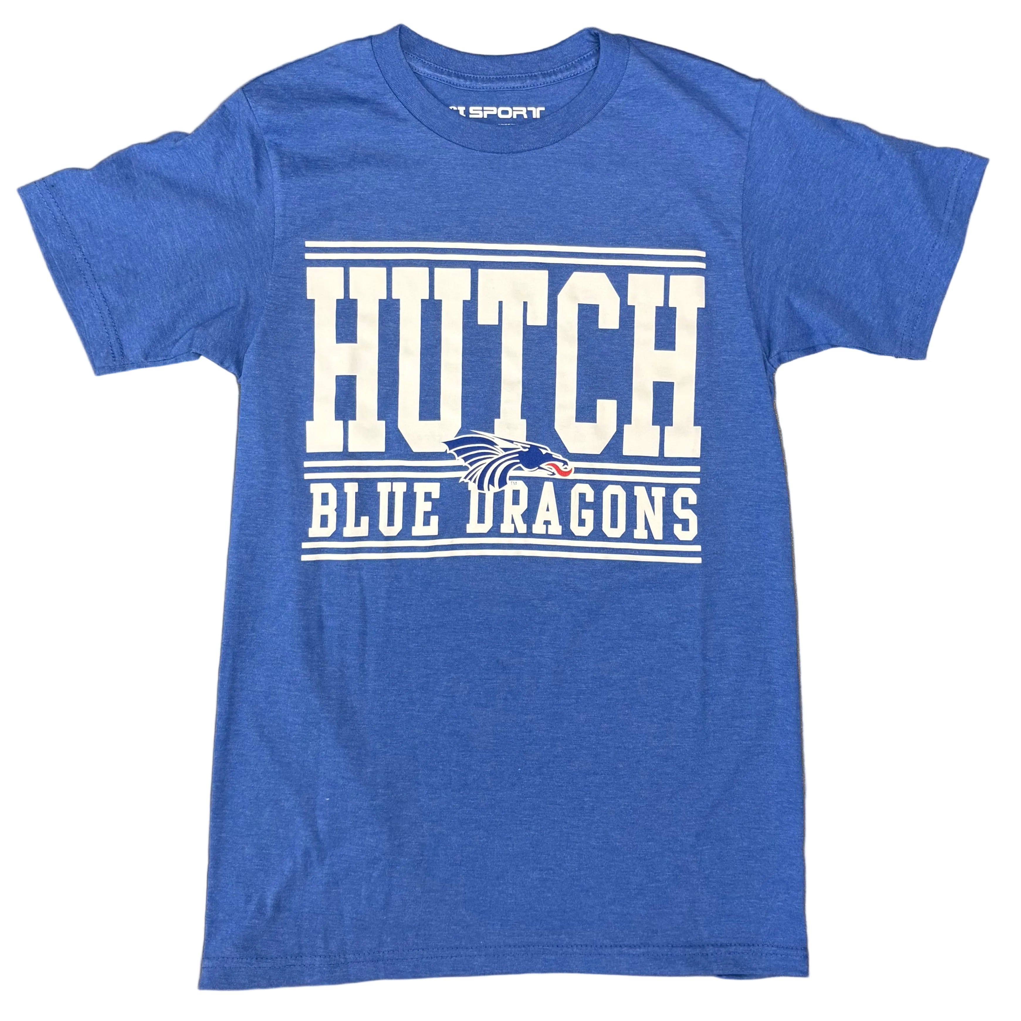 This tee is a couple shades lighter than royal blue but but a couple shades darker than sky blue. 60% cotton, 40% polyester. Oversized font with a power dragon in the middle.