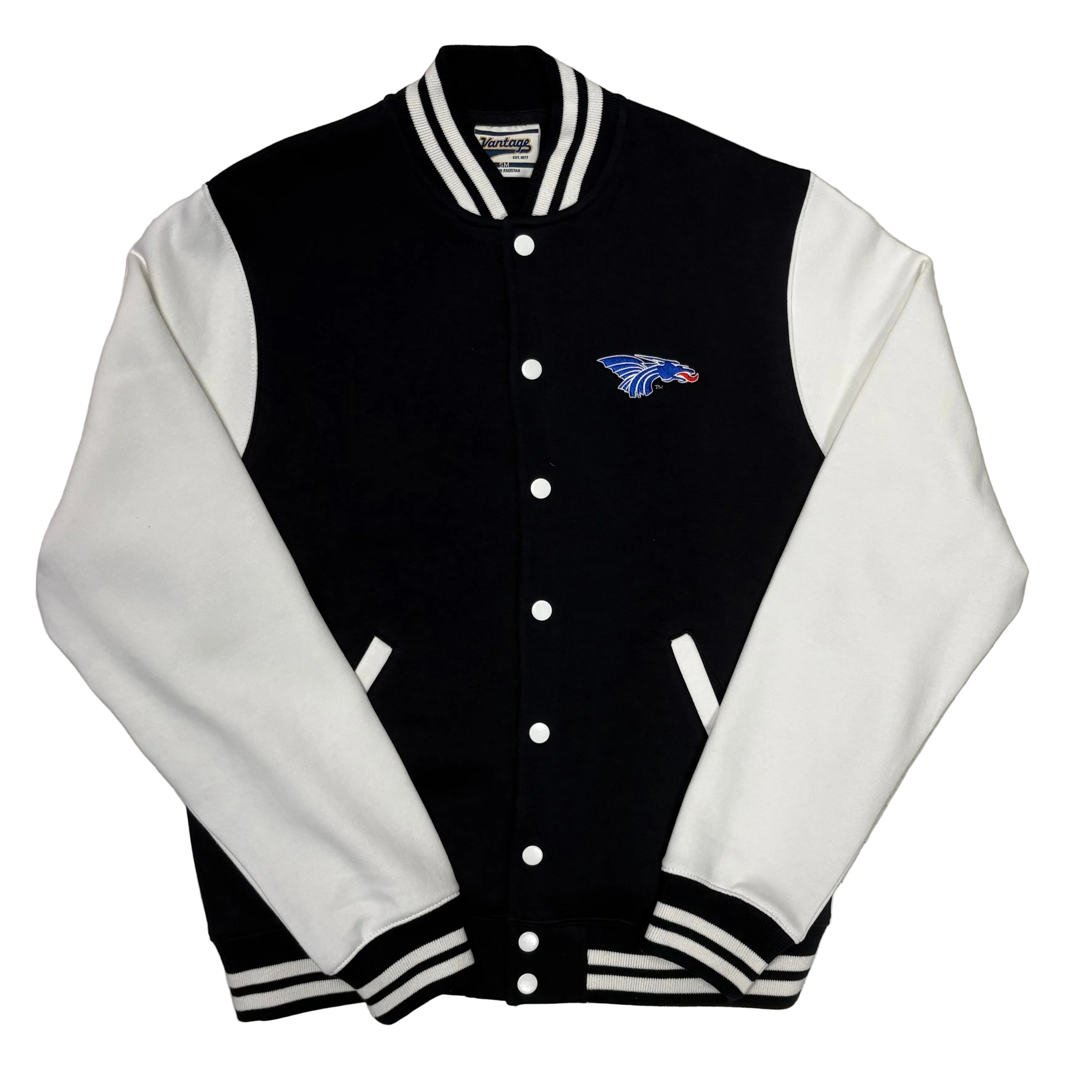 Men's letterman style, collared jacket. The body is dark navy, almost black. The arms are white. Duke the Dragon is embroidered in royal, white, and red on the left breast. Snap buttons. This jacket is 70% cotton, 30% polyester-- the sleeves are not leather.